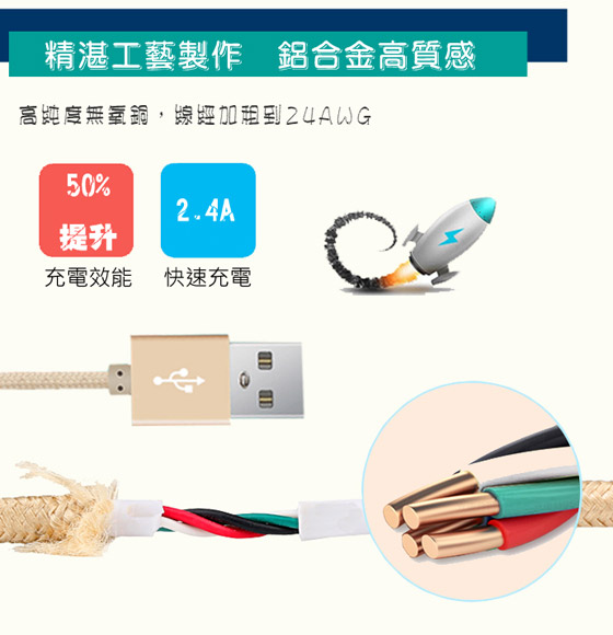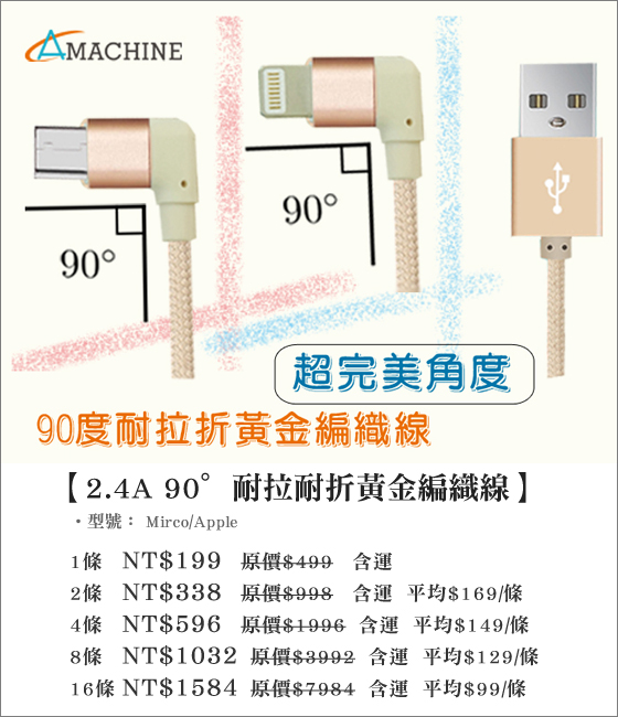 | 人性設計充電線 完美90度,給你更愉悅的使用經驗 .jpg)      商品說明品名:2.4A 90°耐拉耐折黃金編織線型號:Mirco/Apple 顏色:土豪金 電壓電流:5V/2.4A 材質:鋁合金/編織線 ※商品圖檔顏色因電腦螢幕設定差異會略有不同,以實際商品顏色為準 | 詳細商品說明 | ※其他推薦※